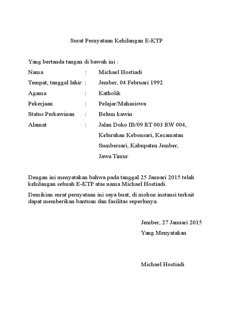 Surat Pernyataan Kehilangan Ktp - Contoh Surat Keterangan Hilang Download Contoh Surat Terlengkap : 5 contoh surat pernyataan kehilangan dokumen sim ktp ijazah atm.. Contoh format surat keterangan kehilangan siapa yang menyangka anda tiba tiba mengalami hal yang menjengkelkan sekaligus bikin repot. 10+ contoh surat kehilangan ktp.sebenarnya sangat mudah untuk membuat disini kami menyediakan contoh surat pernyataan kehilangan dokumen berbentuk file.doc dan tinggal di edit sesuai dengan kebutuhan anda sendiri. Misalnya saja disaat kita kehilangan beberapa dokumen dan barang berharga seperti stnk sim bpkb ktp kartu tanda mahasiswa ktm ijazah faktur kwitansi kartu bpjs sertifikat surat kepemilikan tanah dan lainnya atau kehilangan sesuatu berbentuk barang yang dapat dikatakan sangat. Kantor pelayanan laporan surat kehilangan di kepolisian setempat buka 24 jam, anda bisa langsung datang kapan saja. Contoh surat pernyataan kehilangan kartu askes contoh surat.