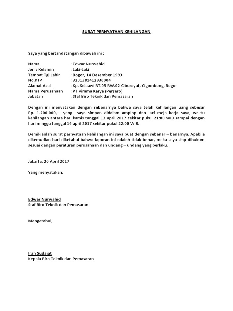 Kumpulan Surat Pernyataan from imgv2-1-f.scribdassets.com Contoh surat pernyataan kehilangan untuk dokumen faktur pada bagian di atas anda sudah mengetahui mengenai bagian bagian penting yang harus ada dalam contoh surat pernyataan kehilangan dokumen faktur. Cara mengurus surat kehilangan ktp Ketika kita ingin mengajukan beasiswa pendidikan selain harus menyertakan surat keterangan tidak mampu. 29 contoh surat kuasa berbagai keperluan yang benar surat kuasa pengertian fungsi macam unsur gurupendidikan com untuk pembahasan kali ini kami. Contoh surat pernyataan kehilangan ktp format 595 x 842 syarat dan cara mengurus e ktp yang hilang format 1200 x 800 pixel download contoh surat pernyataan kehilangan yang anda perlukan format 1069 x 532 pixel download cara mengurus ktp hilang rusak terupdate. Jika barang yang hilang merupakan dokumen yang penting, misalnya ktm, sim, stnk, bpkb, ataupun ktp. — steemit surat keterangan kehilangan ijazah 5 contoh surat pernyataan kehilangan dokumen : 002/09, jagabaya 3, kedaton, bandar metro, lampung